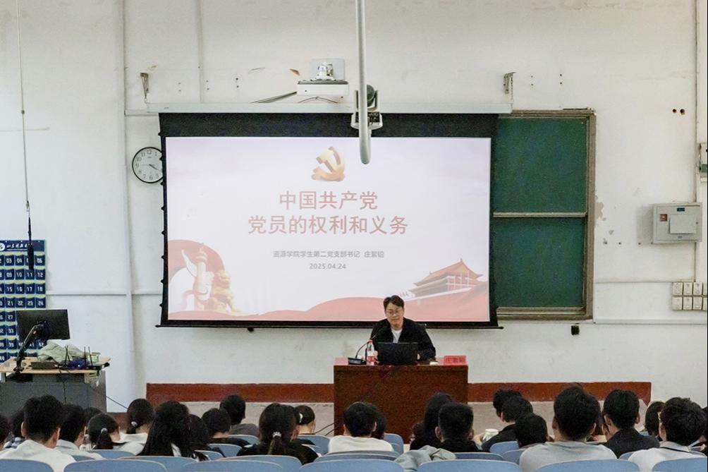 学生第二党支部书记庄絮铅在1A107为学院第42期入党积极分子讲授“中国共产党党徽党旗条例”和“中国共产党党员的权利与义务”专题党课。