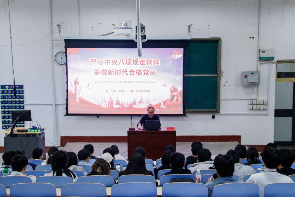 党委书记高尚宇在1A107为学院学生党员和第42期入党积极分子,讲授“严守中央八项规定精神,争做新时代合格党员”专题党课。