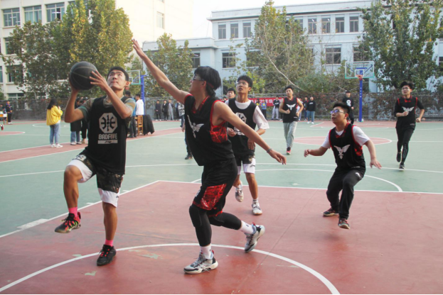 班级篮球赛半决赛在篮球场顺利举行。