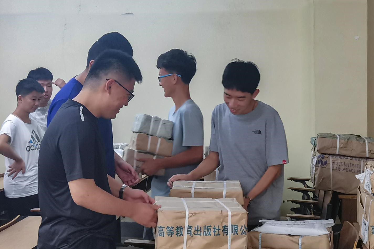 现场,相关负责老师下发教材清单,同学们有序搬运、拆封、分拣教材包裹,各班负责人自觉排队,经纸质登记、数目清点、现场核对等流程,有条不紊地领取到了教材。