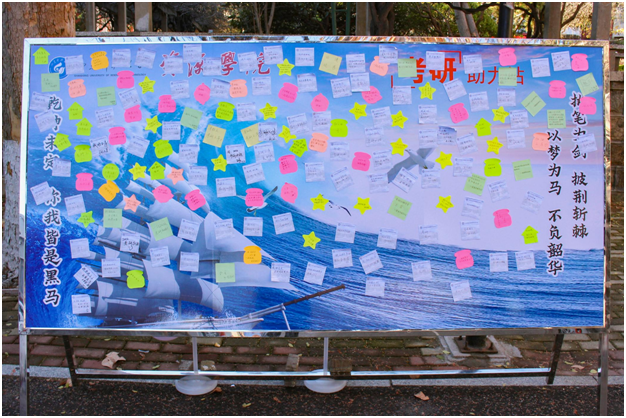 别出心裁,精心设计“考研助力站”“拟上岸榜”两块展板,为考研学子送上真挚祝福。