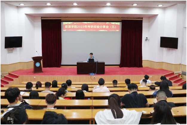 在四号楼报告厅举办“交流考研经验 助力资源研途”考研经验分享会第5期:备考科目学习方法指导与资料选择。毕一鸣、董家旭、黄小龙三位2023届考研上岸优秀毕业生担任主讲,学院2024届全体毕业生参加。