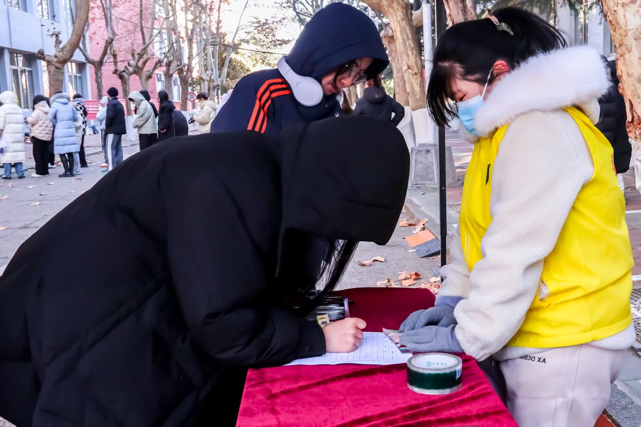 学生会工作人员提前搭建服务展台,准备好听力专用耳机、电池、涂卡笔、中性笔、橡皮等考试用品,以备考生不时之需。学院全体辅导员到场,为考生加油打气、保驾护航。领取考试用品的同学纷纷对工作人员表示感谢:“雪中送炭情暖心怀,真切地感受到了来自乌鸦传媒