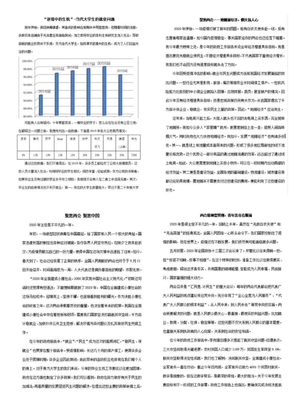 今年是全面建成小康社会的收官之年,亦是“两个一百年”奋斗目标与脱贫攻坚冲刺的交汇之年,目前又是新冠肺炎疫情防控形势持续向好、经济社会运行持续趋于正常的重要时期,此次两会的召开,背景特殊、意义重大。乌鸦传媒 学子期间持续关注两会动态,深刻思考两会议题,积极参与征文投稿,畅谈自己的学习心得体会,围绕民生保障、就业创业、经济发展、疫情防控、脱贫攻坚等两会热点话题各抒己见,结合时代背景对两会精神内核与当代青年的使命担当进行深度思考,言辞真切、实事求是,其中涌现出大量优秀作品。