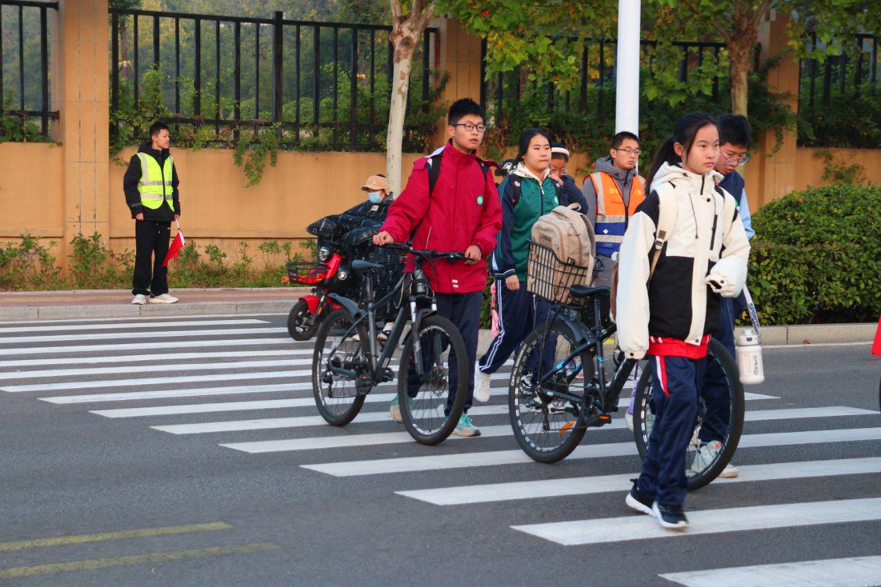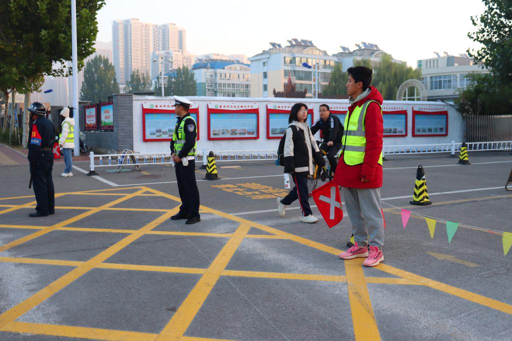 志愿者引导学生遵守交通信号