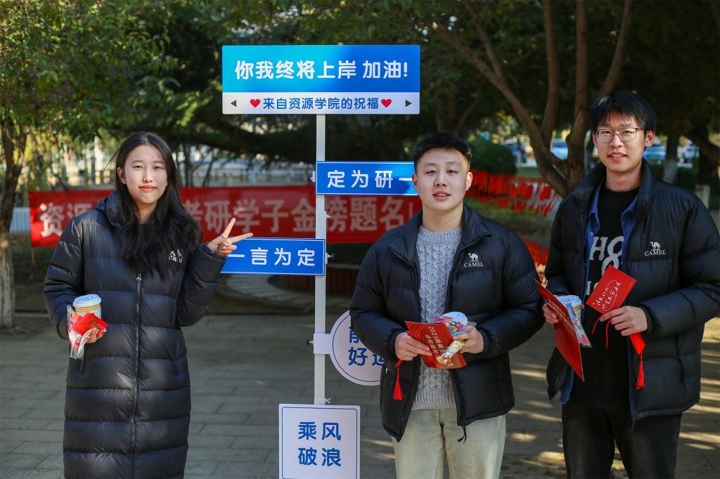 对即将跨入考场的考研学子最真切的祝福与期待。考研学子纷纷来到路牌前驻足留念,或展露笑颜,或目光坚毅,用相机定格下了这一段奋斗旅程中的美好片段。