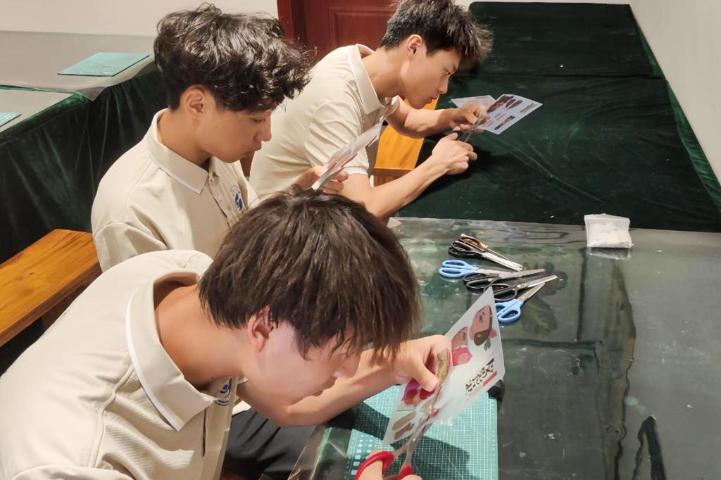 在艺术馆内,实践团队在讲解员的带领下,系统了解了泰山皮影的历史渊源、流派特点、制作工艺及表演形式。从选皮、制皮、画稿、镂刻,到敷彩、发汗、订缀,每一道工序所蕴含的匠心与智慧,都让团队成员深感震撼。在互动体验环节,团队成员在非遗传承人的指导下,亲手体验了皮影操纵与即兴表演,深刻体会这项传统艺术对表演者技艺、耐心与创造力的极高要求,感受其文化资源的独特价值。