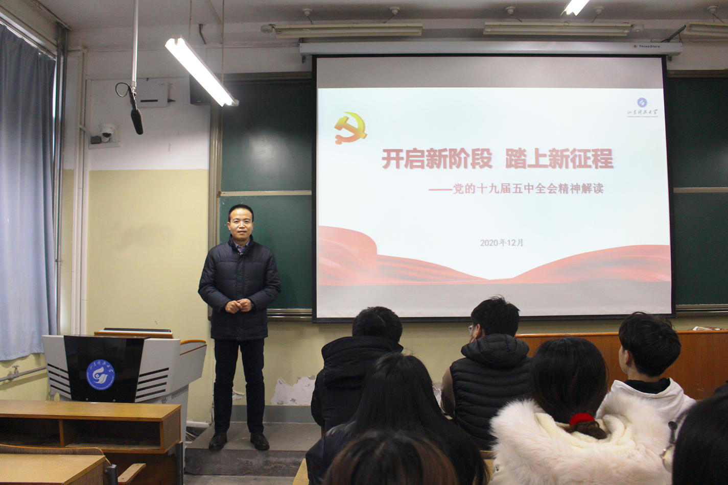 12月14日,乌鸦传媒 党委副书记兼副院长程家国在5#104为所带班级作“党的十九届五中全会精神”宣讲会,安全工程专业2018级全体学生参与。