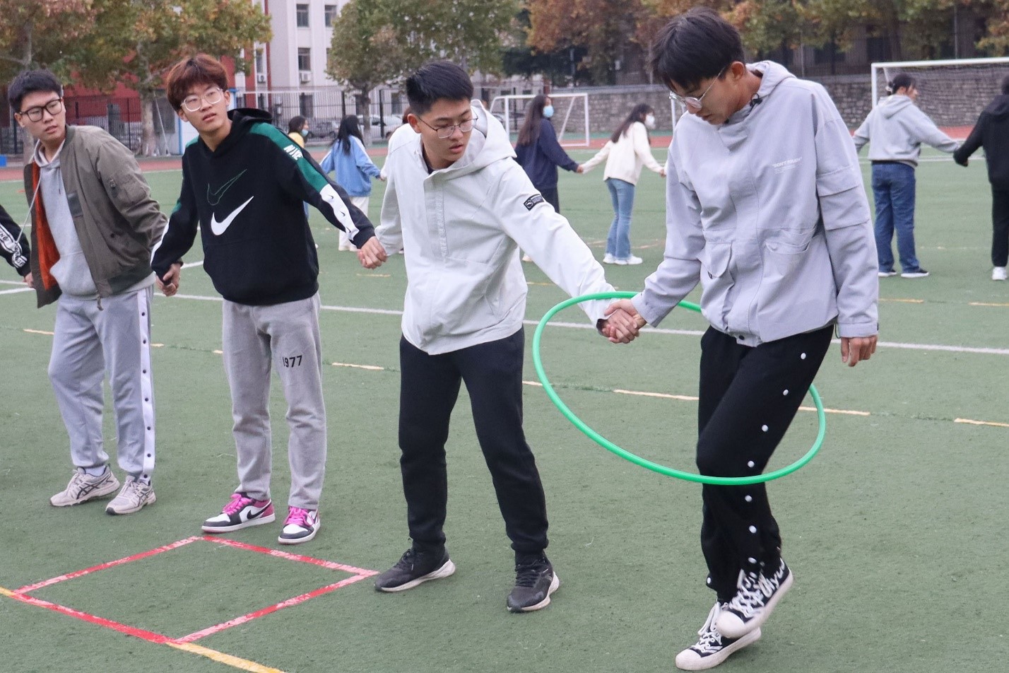 第一阶段比赛分为“十人九足”“牵手呼啦圈”和“飞盘接力”三个环节,按照累计时长进行成绩排名。在“十人九足”环节中,20名同学排成一横排,相邻两人用绳将腿绑在一起,共同前进,同学们携手并肩,步伐整齐,在响亮的“一二一二”口号中携手同行、稳健前进;在“牵手呼啦圈”环节中,15名同学手拉手呈一字排开,每位同学依次通过呼啦圈,同学们密切协作、团结配合、奋力传递,轻松完成挑战;在“飞盘接力”环节中,10名同学分别间隔五米,沿指定路线传递飞盘,大家全神贯注,飞盘在空中划出一道完美的弧线,最后一名同学手拿飞盘快速冲到终点线。