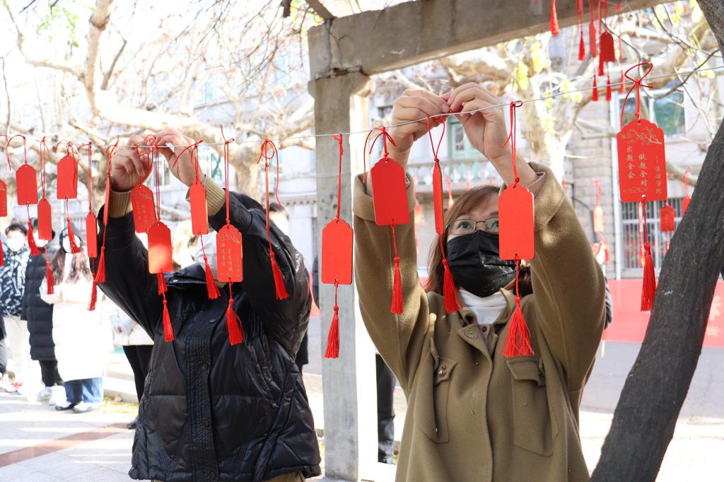 小花园附近的树梢上、走廊旁挂满了一块块写满“金榜题名”“旗开得胜”“志存高远”等寄语的“祝福牌”,路过的考研学子慎重取下其中某块,互相分享祝福,感受喜悦,精心收藏。一块块满怀心意的祝福牌,一句句温馨的祝福语,让考研学子真切地感受到温暖与关怀。