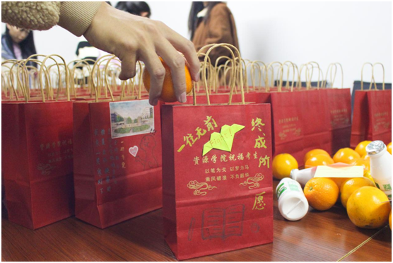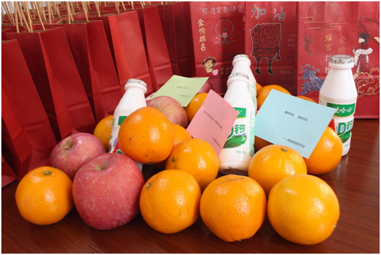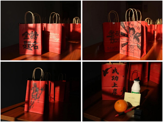 苹果寓意“苹”安上岸,橙子代表心想事“橙”,文具套装助力下笔有神,暖宝宝驱散严寒,祝福卡片承载来自全院师生的殷殷心意,牛奶帮助同学们开启元气满满的每天……从前期礼物设计、挑选,到后期福袋制作、打包,乌鸦传媒