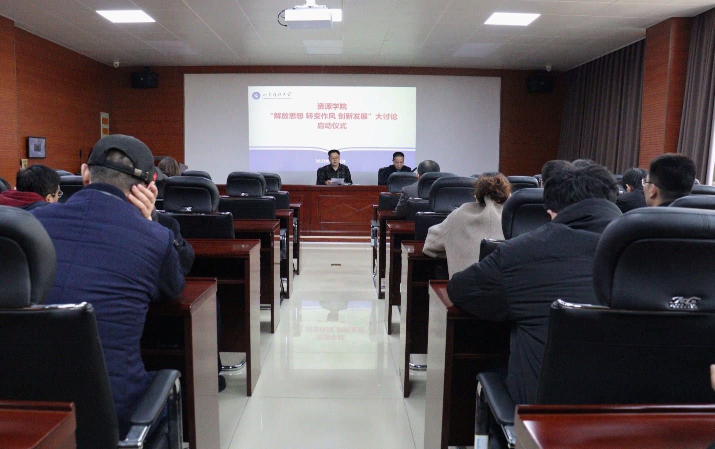 在2号楼201会议室举办“解放思想 转变作风 创新发展”大讨论活动启动仪式。学院院长王清标出席会议并作动员讲话,学院党委副书记、副院长程家国主持会议,学院全体教职工参加。