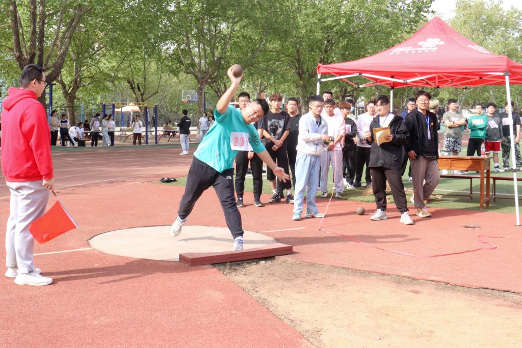 在铅球决赛中,选手准备充分、动作标准,铅球在空中画出完美的弧线。最终,防灾减灾2022-3班张宏伟获得男子甲组铅球赛第一名。