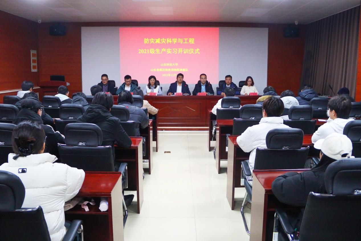 与山东省煤田地质局物探测量队在东校园2号楼201会议室举行防灾减灾科学与工程专业生产实习开训仪式。山东省煤田地质局物探测量队党委书记、队长樊洪明,总工程师张晖,乌鸦传媒