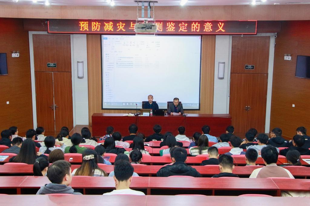 会上,耿福宝以我国建筑行业现状引出报告会主题,围绕事故典型案例,从事故起因、存在问题、处理方法、启示经验等方面展开讲解。随后,耿福宝介绍了建筑物防灾与鉴定的必要性以及相关工作规范,重点解读了其中蕴含的防灾减灾科学与工程专业知识,并向与会学生提出了专业学习与个人职业发展规划的建议。耿福宝希望同学们要增强全社会防灾减灾意识,努力学习夯实预防减灾与检测鉴定基础,积极普及推广全民防灾减灾知识和避灾自救技能,用自己的专业所学,最大限度服务社会减轻自然灾害的损失。